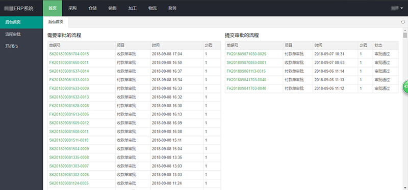 定制ERP系统开发,模块有采购、仓储、销售、加工、物流、财务、系统设置等